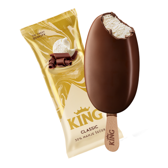 King, kralj užitka, donosi vam sladoled dobro poznatog okusa vanilije, preliven hrskavom mliječnom čokoladom, ali uz 30% manje šećera.