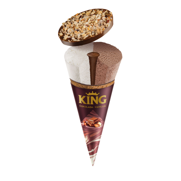 Uz King kornet Čokolada-vanilija više nikad nećete biti u nedoumici oko izbora sladoleda od čokolade ili vanilije jer se ova dva sladoledna okusa savršeno nadopunjuju u slasnom King kornetu.