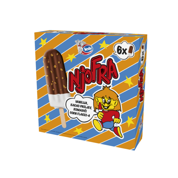 Mjesta za klasike uvijek ima! Njofra, legendarni sladoled na štapiću kojeg obožavaju i djeca i odrasli, vraća se u multipack pakiranju od 6 komada, idealnom za dijeljenje. Uz brojne uspomene iz djetinjstva Njofra je bio neizostavan dio odrastanja u osamdesetima, a sada je vrijeme i da nove generacije otkriju fantastičan okus krem sladoleda okusa vanilije s kakao preljevom i hrskavim posipom od kukuruznih pahuljica. Potražite ga i podijelite!