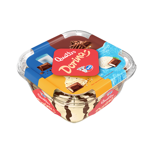 U suradnji s najomiljenijim čokoladnim brendom u Hrvatskoj, Dorinom, stvorili smo sladoled koji će vas osvojiti na prvu! Nadahnuti najpopularnijim okusima Dorine, novi Quattro dolazi u neodoljivoj kombinaciji u kojoj su Dorina Mliječna, Dorina Noisette, Dorina Mliječno punjenje s komadićima keksa i Dorina Ledena. Čokoladni preljevi i posipi u savršenoj kombinaciji s punoćom okusa pružaju nezaboravno iskustvo koje je jednako vizualno atraktivno i kremasto na nepcu.
