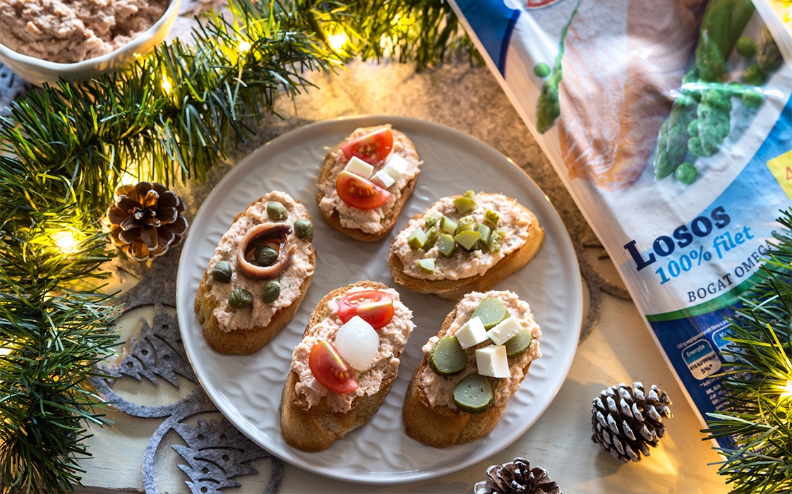Najbolje je početi s malim zalogajima. Pečene filete lososa u nekoliko smo minuta pretvorili u namaz koji će gostima za stolom biti savršen uvod u blagdansku priču. Hrskavi kruh kao podloga i razni dodaci poput kapara, rajčica ili feta sira u okusno-dekorativnoj ulozi, zgodan su finger food kojeg možete poslužiti na svakom partyju.