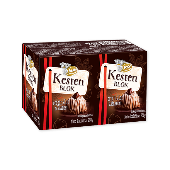 Savršeno nedjeljno popodne u dvoje provest ćete uz Ledo Kesten blok, točnije duplu porciju kesten pirea za vas i vašu bolju polovicu. Zaslađeni kesten pire možete koristiti i pri izradi ukusnih kolača od kestena, rođendanskih torti ili slanih delicija te se poigrati svojom kreativnošću u osmišljanju novih recepata, a pri tome uključiti cijelu obitelj i uživati u gastronomskom istraživanju s okusom jeseni.