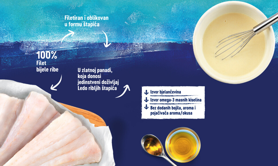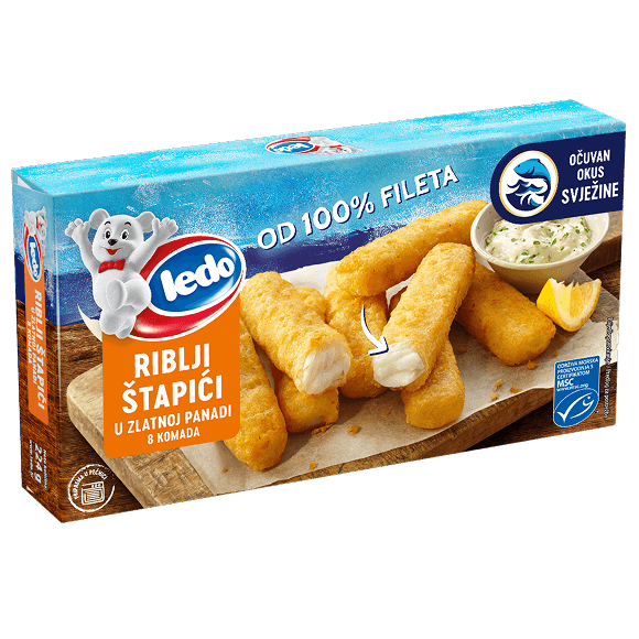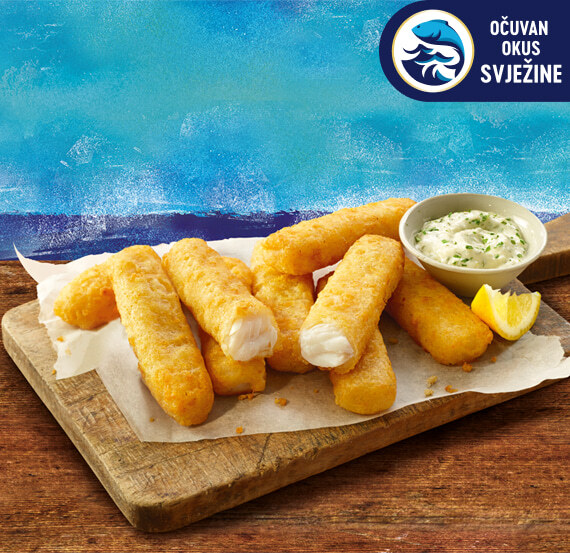 Pretprženi, panirani i oblikovani proizvod od komada ribljeg fileta, u zlatnoj panadi donosi jedinstven doživljaj ribljih štapića.