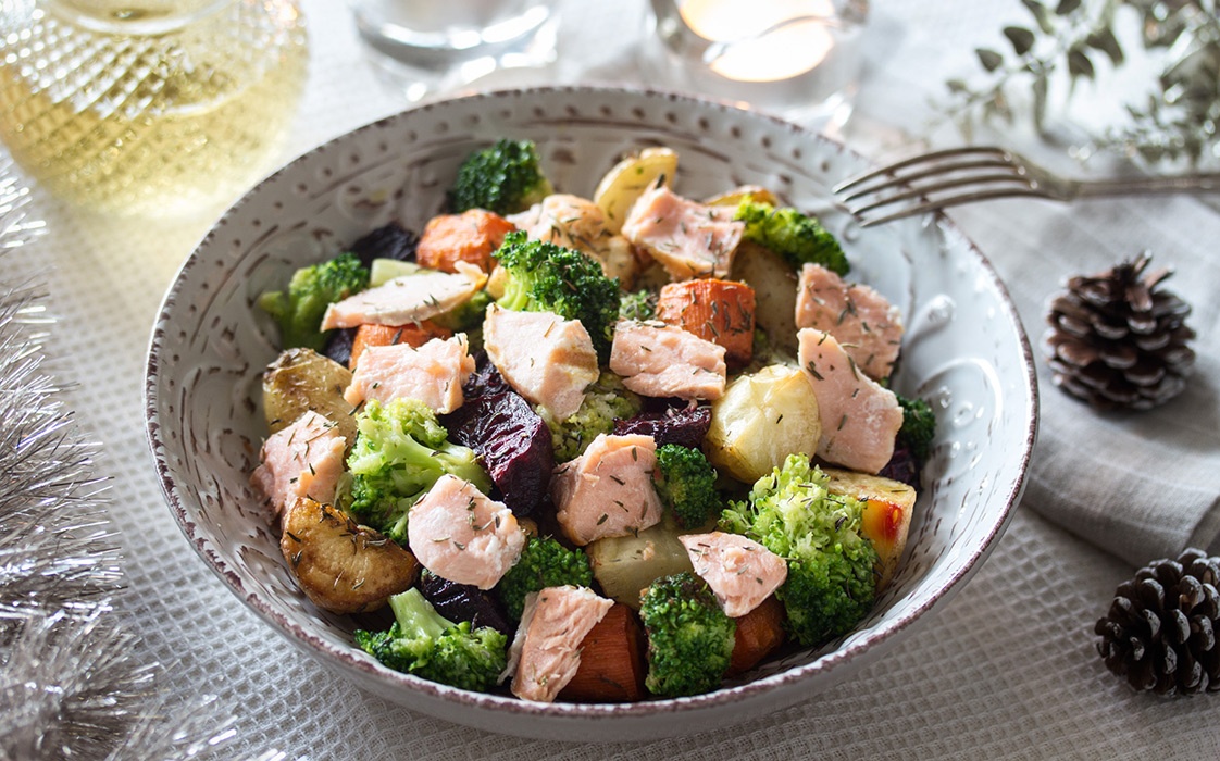 Vrijeme je da se ozbiljnije zagrijemo, ipak su dani već prilično hladni. Stoga će topla salata prepuna zimskog povrća poput cikle, krumpira, mrkve i brokule biti idealan idući korak. Losos smo i ovaj put ispekli na grill tavi te njegovo meso pomiješali s povrćem iz pećnice čije će okuse dodatno istaknuti majčina dušica, balzamični ocat i maslinovo ulje. Svakako, odličan način da u jedan obrok uklopite puno povrća i ribu.