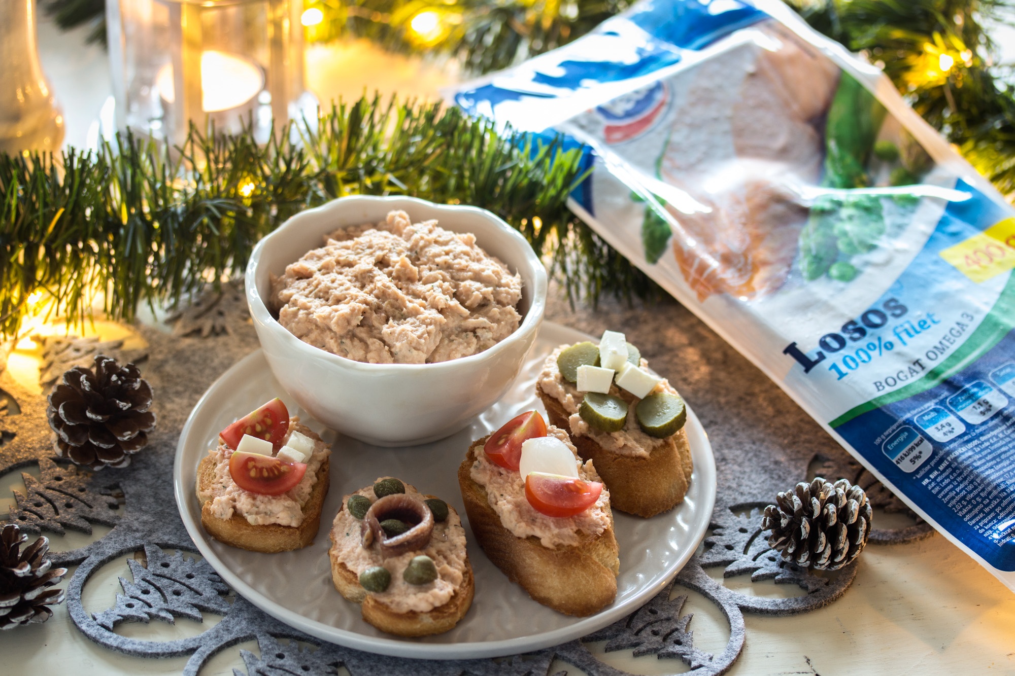 Najbolje je početi s malim zalogajima. Pečene filete lososa u nekoliko smo minuta pretvorili u namaz koji će gostima za stolom biti savršen uvod u blagdansku priču. Hrskavi kruh kao podloga i razni dodaci poput kapara, rajčica ili feta sira u okusno-dekorativnoj ulozi, zgodan su finger food kojeg možete poslužiti na svakom partyju.