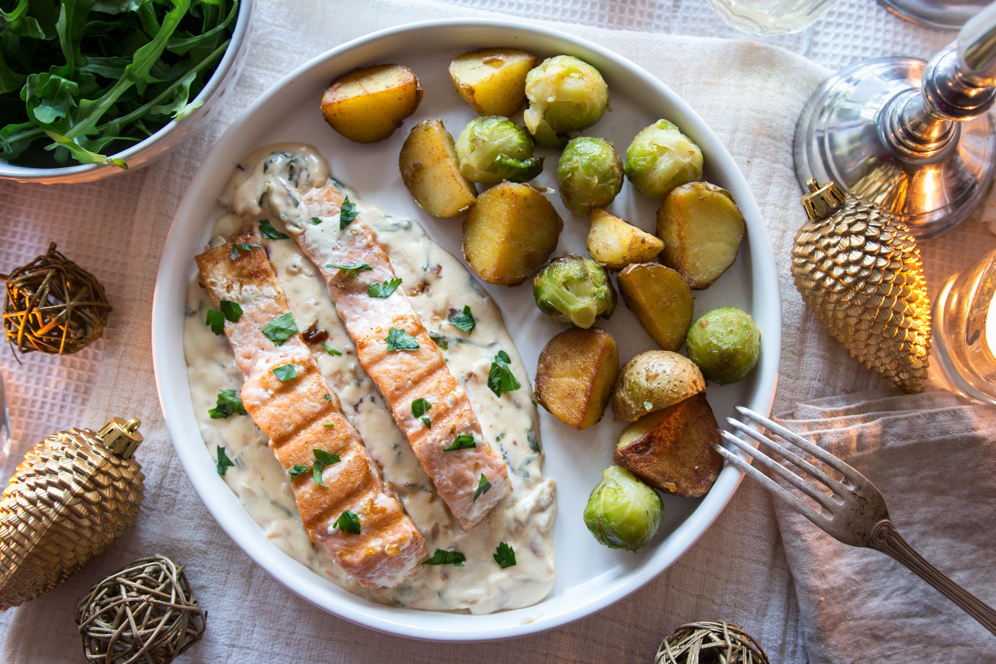 I tada, kada su očekivanja gostiju na najvišoj razini, na stol stižu prekrasni fileti lososa u komadu. Za prilog smo ostali u zimskom raspoloženju, kelj pupčar i krumpir zapečeni na tavici bit će slastan dodatak. Fileti lososa položeni na sočan i kremasti umak s parmezanom, sušenim rajčicama i baby blitvom ostvarili su savršen spoj.