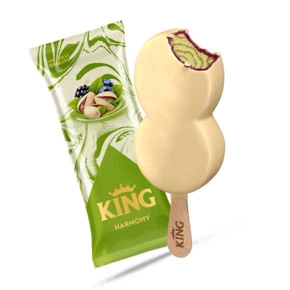 King Harmony skladno sljubljuje okus pistacije obogaćen unutarnjim preljevom od pistacije, mekanim preljevom od bobičastog voća i vanjskim preljevom od hrskave bijele čokolade – kombinacija stvorena za maksimalno uživanje.