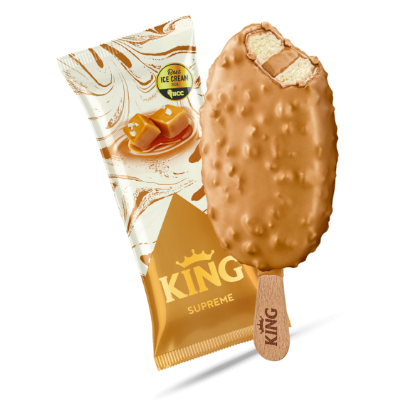Krenite na putovanje kroz nova iskustva s King Supreme sladoledom na štapiću koji donosi okus slane karamele - jednog od najpoželjnijih okusa na svijetu. Ovaj sladoled nudi savršeno izbalansiranu kombinaciju slanog i slatkog. Središnji dio sladoleda s okusom karamele krije punjenje od mliječne karamele koje će vas osvojiti svojom kremoznošću. Mekani preljev od slane karamele, ogrnut dodatnim preljevom od bijele čokolade okusa karamele, obogaćen je ukusnim komadićima hrskavog keksa, što će dodati poseban šarm svakom zalogaju.